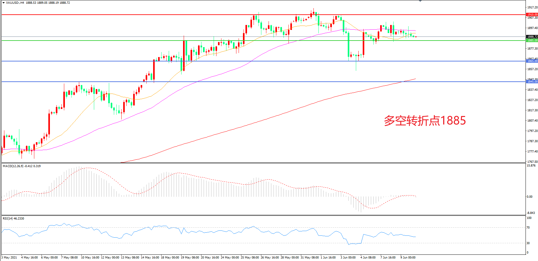 4小时图看,金价冲高回落,区间震荡迹象明,1885成为多空分水岭,1910成为上方阻力,MACD绿柱缩短,RSI指标走平,日内延续震荡概率较大。