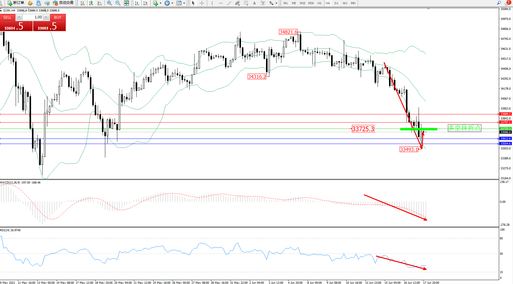 技术点评:空头动力延续布林带指标通道下轨附近节点不断向下移动中,持续下挫至33493位置后开始巨震,短期回升至下轨内侧整理,空头动力有进一步向下移动态势,布林带指标呈张口走势后开始有收口迹象,但下行区域依旧,短期未能改变,MACD指标处于0轴线下方空头区域维持震荡下行后开始平移,RSI指标处于50均衡线下方空头区域维持整理平移中;