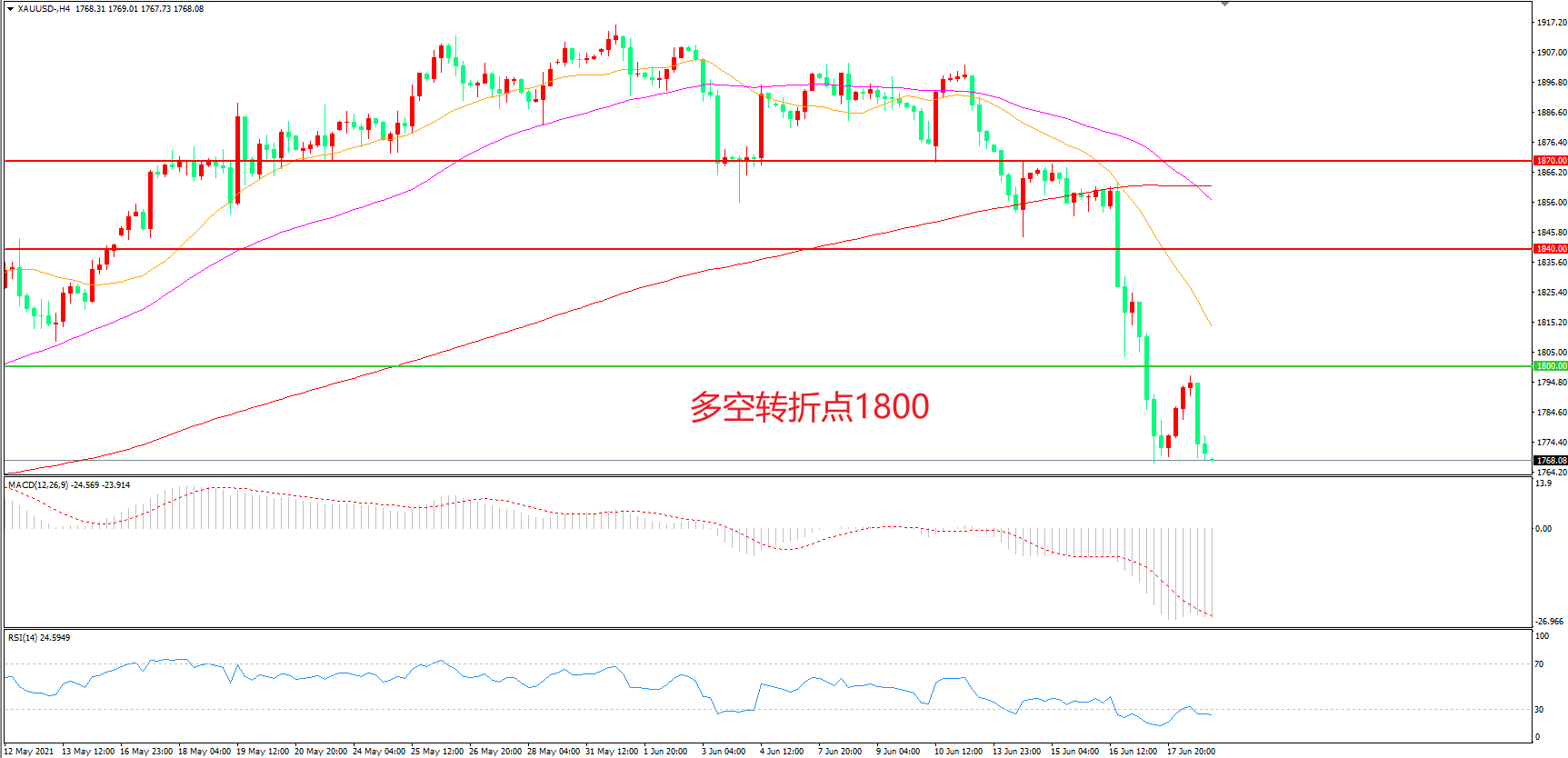 4小时图看,金价连续长阴下破,短期表现极度低迷,1800关口被跌破,1760成为短线支撑,MACD绿柱增加,RSI指标向下,日内震荡下行概率较大。