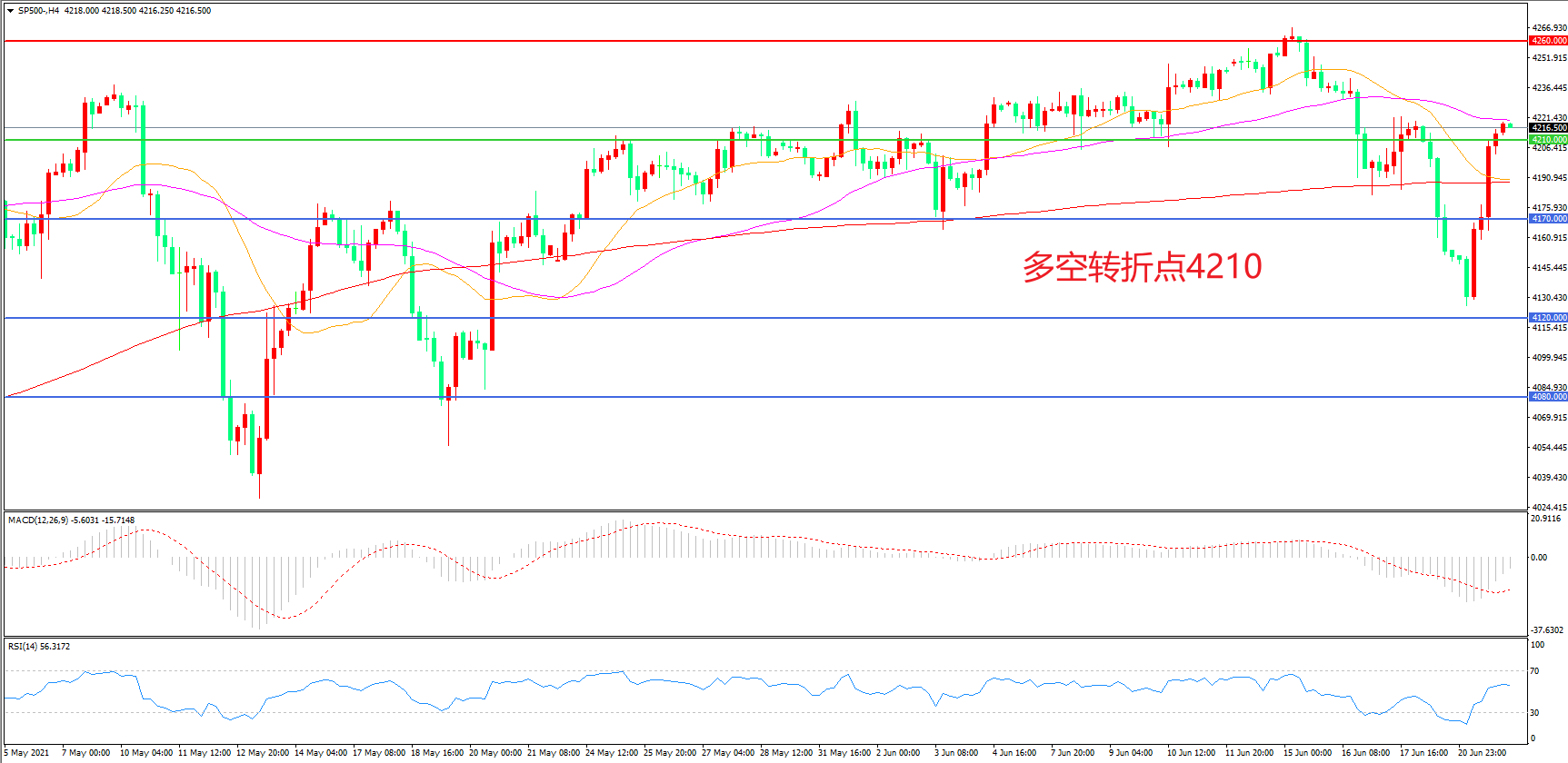 4小时图看,标普500回踩4210后大幅拉升,短期跌势有所缓解,200周期均线被顺利收复,MACD绿柱缩短,RSI指标走平,日内震荡上行概率较大。