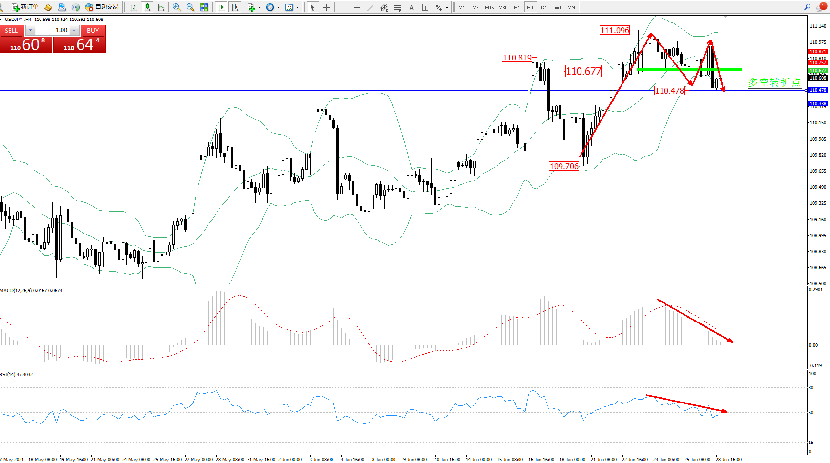 技术点评:多头动力持续震荡上扬至布林带指标上轨110.096位置后遇阻,开始震荡缓慢回撤,触及下轨附近节点后开始不断震荡向下移动中,布林带指标呈收口走势后开始缓慢张口,MACD指标处于多头区域高位持续震荡回撤,触及0轴线附近弱势徘徊后有破位下行迹象,RSI指标空头区域持续震荡回撤至50均衡线附近弱势徘徊中;