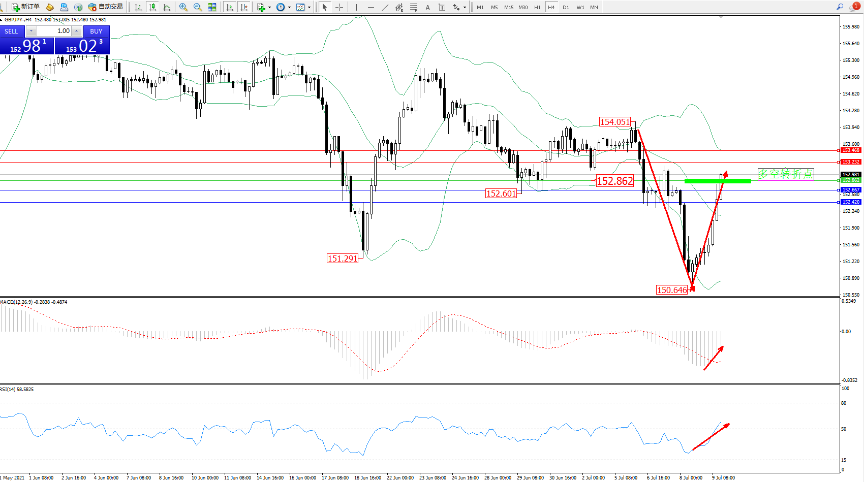 技术点评:高位空头动力急速下挫至150.646位置后,呈V型反转走势强势拉升中,处于布林带指标中上轨区间持续向上拉升中,多头动力有进一步向上回升态势,布林带指标开始有收口迹象,MACD指标处于空头区域低位震荡回升,RSI指标低位多头动力震荡上移突破50均衡线进入多头区域上移中;