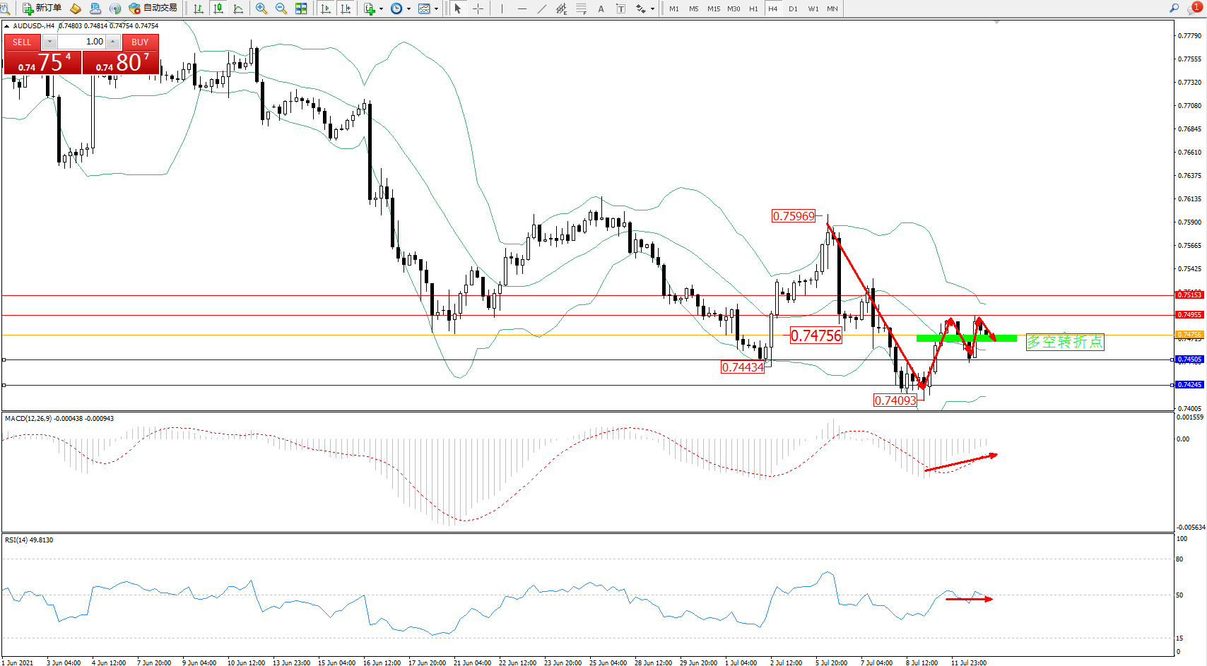 备选策略:0.74756下方看跌,目标0.74505、0.74245