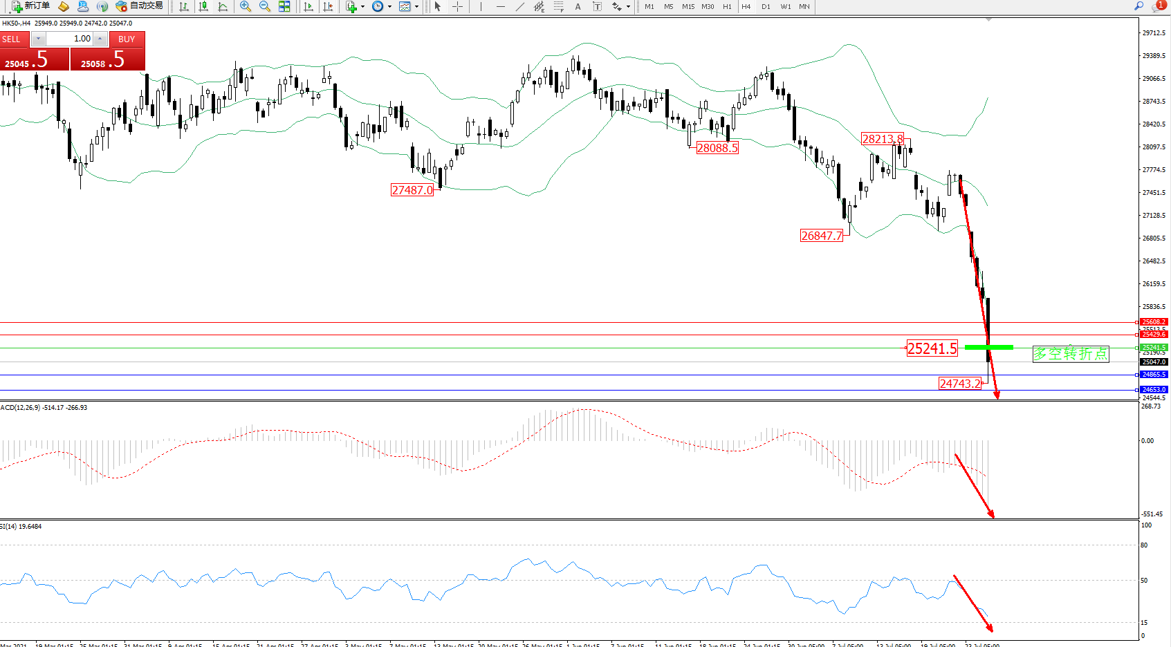 技术点评:空头动力延续布林带指标下轨附近急速下挫,跌势未见止步迹象,低位抵达24743位置后有继续向下移动态势,布林带指标呈张口走势持续中,MACD指标处于空头区域持续震荡向下移动中,RSI指标处于空头区域跌势态势良好;