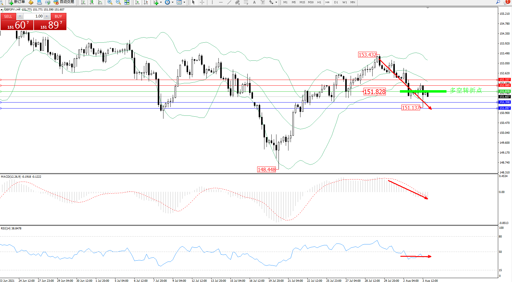 技术点评:空头动力延续布林带指标通道中下轨区间持续震荡向下移动,低位抵达151.137位置后短暂回升,下行趋势态势良好,布林带指标呈下行态势走势持续中,短期或继续向下移动,MACD指标处于0轴线下方空头区域维持震荡下移,RSI指标处于50均衡线下方空头区域维持整理平移;