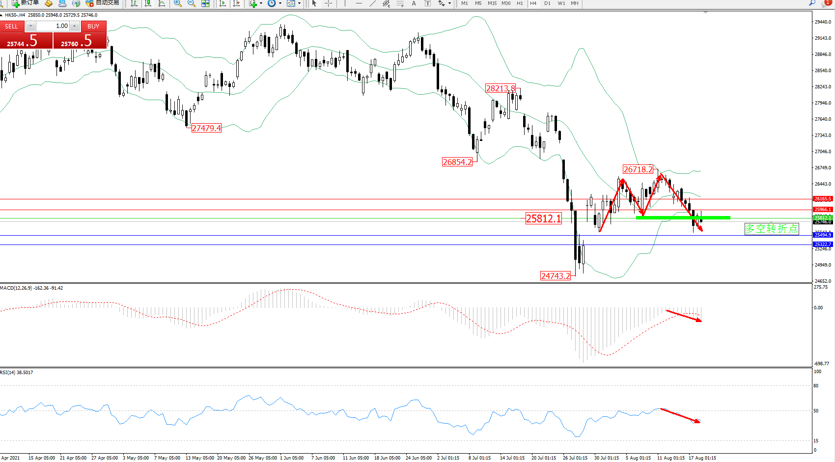 技术点评:M顶形态持续震荡下行,延续布林带指标下轨附近不断向下移动,跌破下轨后开始短暂整理平移,布林带指标呈收口走势后开始逐渐张口,MACD指标处于0轴线下方空头区域持续震荡向下移动中,RSI指标处于50均衡线下方空头区域震荡下行;