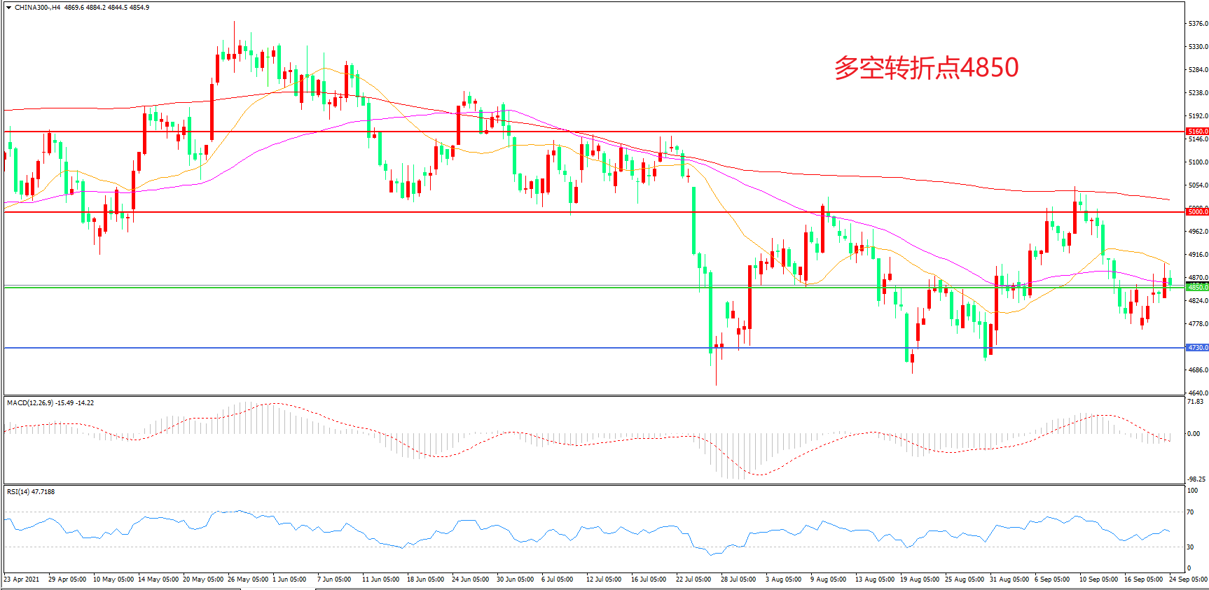 4小时图看,沪深300呈现冲高回落形态,短期行情陷入震荡,均线系统成为上方阻力,4850成为短期多空分水岭,MACD绿柱增加,RSI指标走平,日内延续震荡概率较大。