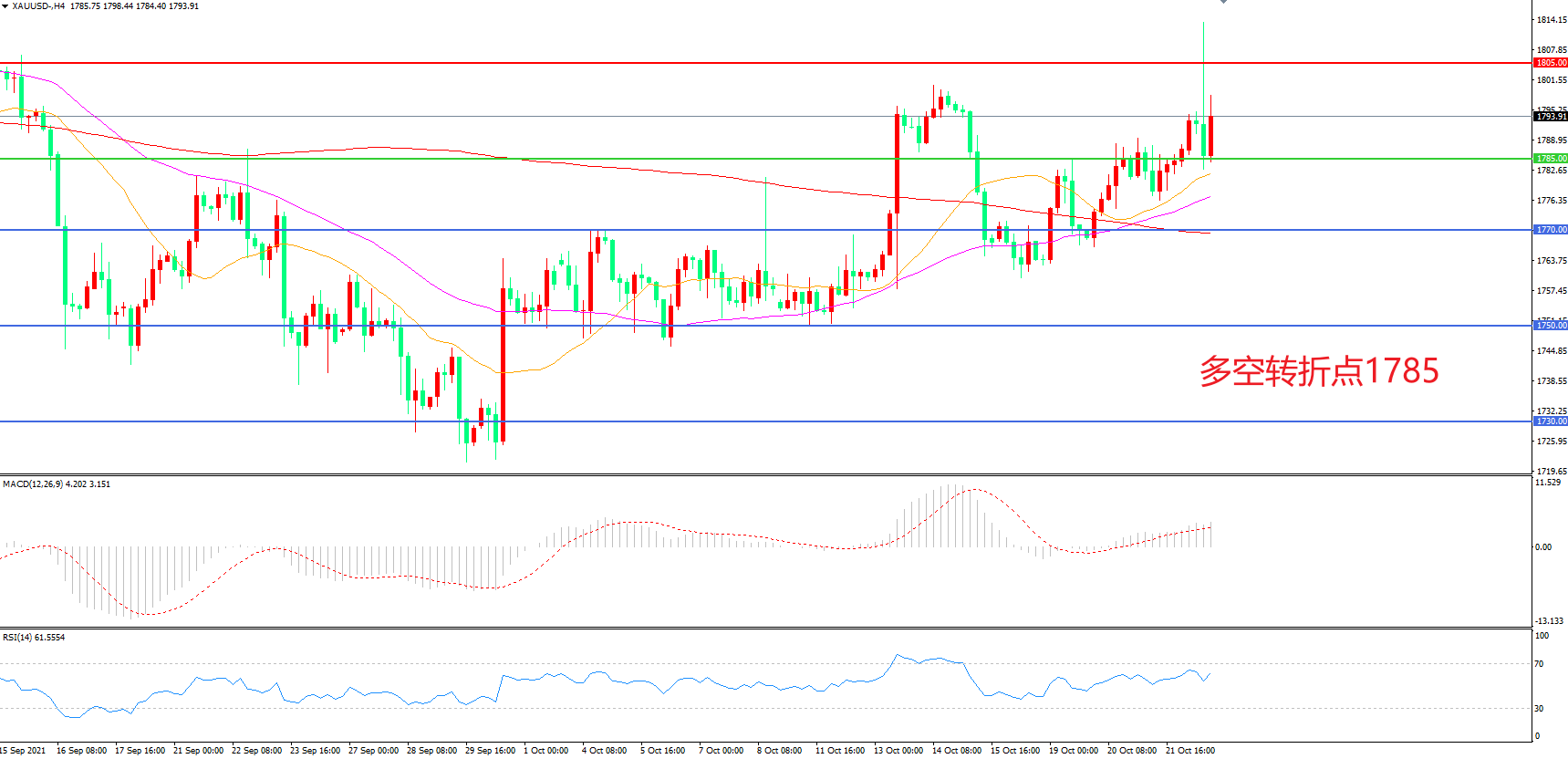 4小时图看,金价突破区间震荡后再度回落,1785成为多空分水岭,均线系统成为下方支撑,1800成为上方阻力,MACD红柱增加,RSI指标走平,日内延续上行概率较大。