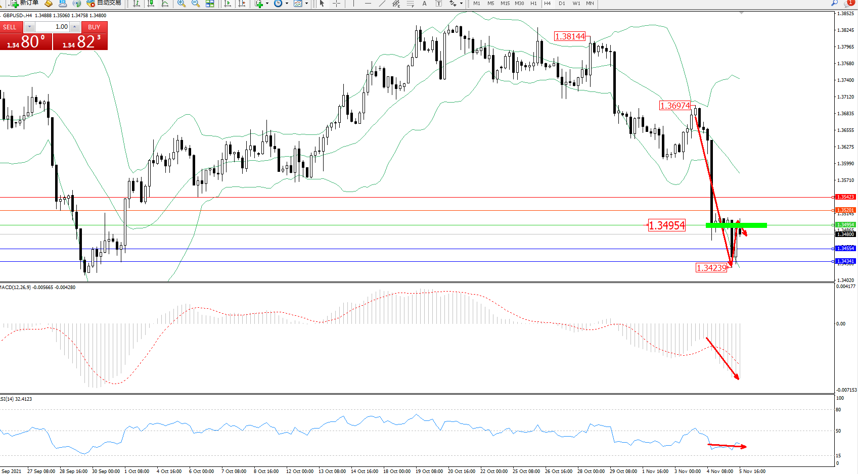 交易策略:1.34954下方看跌,目标1.34554、1.34341