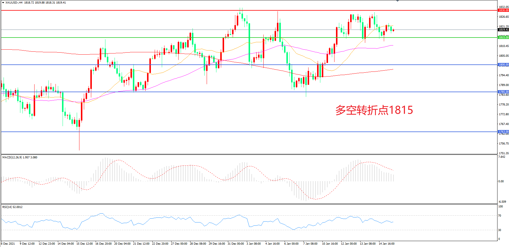 周一(1月17日),美国市场由于马丁路德金纪念日休市,市场交投较为清淡,金价窄幅震荡后收报1819.41美元/盎司。随着市场对美联储3月份加息的预期更加浓厚,多空双方对于未来通胀及缩表的分歧也逐渐明显,美联储将于下周1月25日至26日召开FOMC货币政策会议,在此之前,金价延续震荡概率较大。