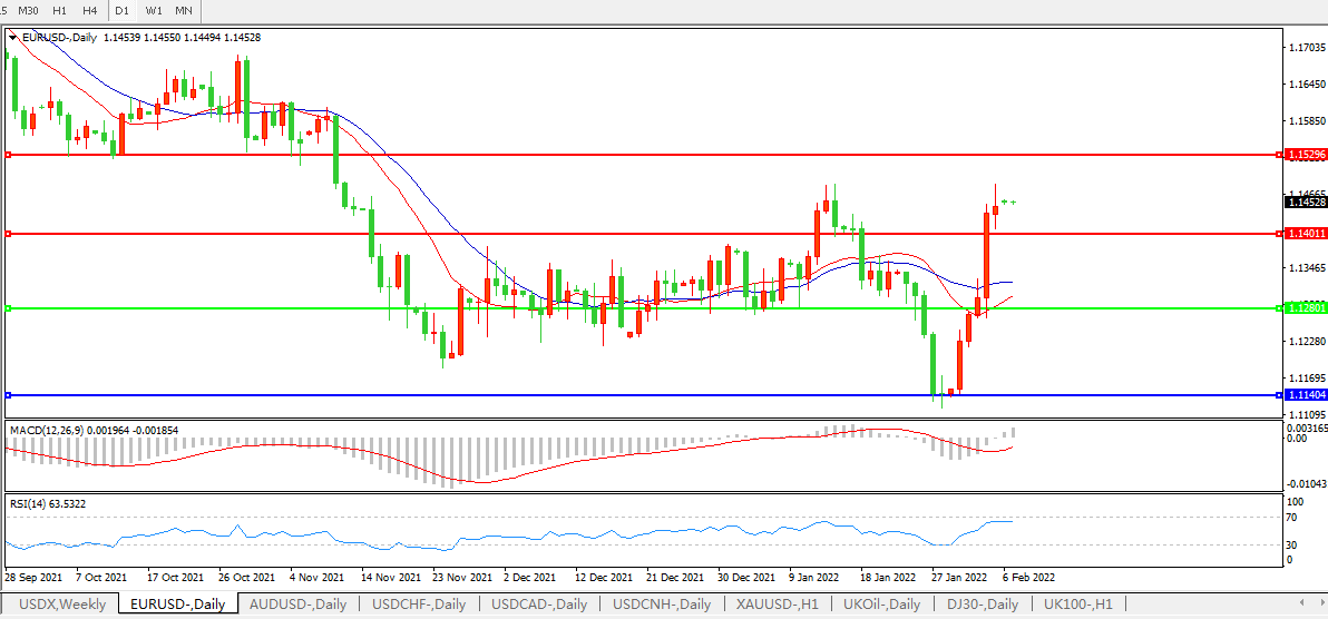 欧元兑美元今日仍走强,上涨0.08%,报1.1449,本周欧元上涨2.67%,创下2020年3月底以来最佳单周表现,这得益于周四欧洲央行的鹰派转变。欧元在阻力位1.1480美元附近停滞不前,因美元在美国就业报告公布后上扬。