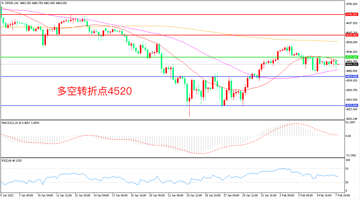 4小时图看,标普500延续窄幅震荡形态,多空博弈胶着,4520成为多空分水岭,55均线成为下方支撑,MACD红柱缩短,RSI指标走平,日内震荡下行概率较大。