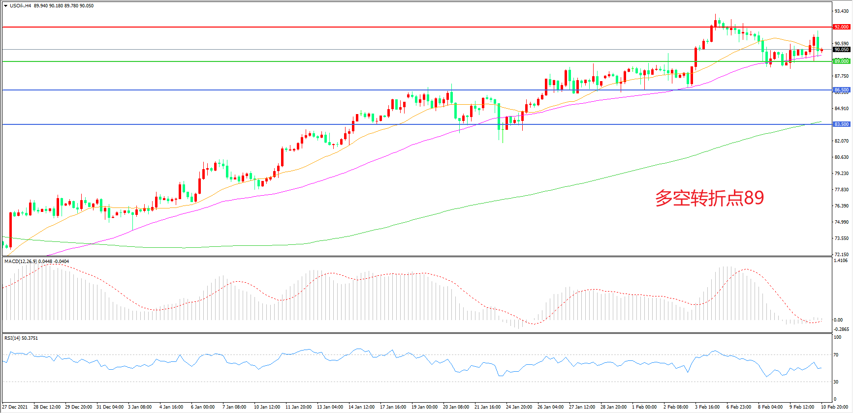4小时图看,油价受阻于92美元后大幅回落,上行趋势暂缓, 89美元成为多空分水岭,MACD红柱增加,RSI指标走平,日内震荡上行概率较大。