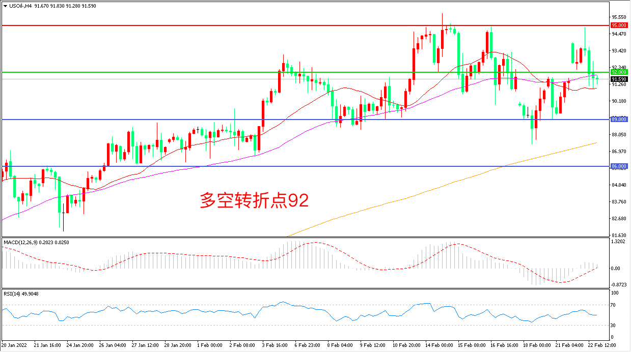 4小时图看,油价冲击95美元后再度回落,上行趋势暂缓,92美元成为多空分水岭,均线系统逐渐走平,MACD红柱缩短,RSI指标邹平,日内震荡上行概率较大。