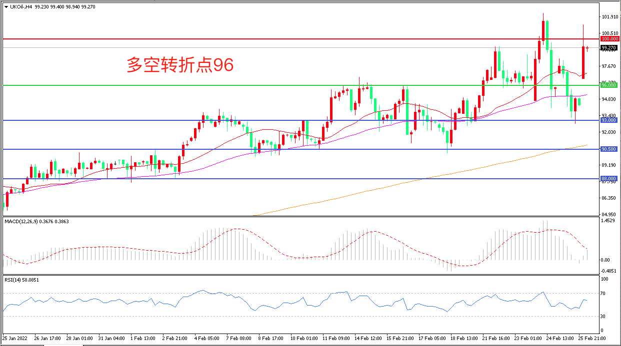 上周五(2月25日),由于俄罗斯释放愿意外交谈判的信号,且欧美强调不会对俄罗斯原油进行制裁,布伦特原油大幅回落,收报94.34美元/桶。周一(2月28日),油价调跳空高开后延续强势表现,截至发稿前收报99.2美元/桶。目前油价虽然高位有调整压力,但供需层面仍需时间来缓解,这会让其维持相对强势格局,3月2日市场会再次迎来OPEC+月度会议,重点关注OPEC成员国表现。