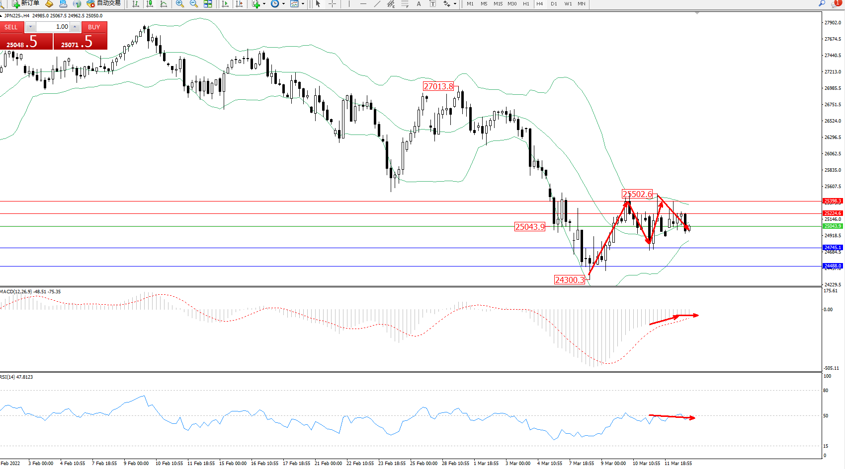 日经指数JPN225——4小时K线图显示: