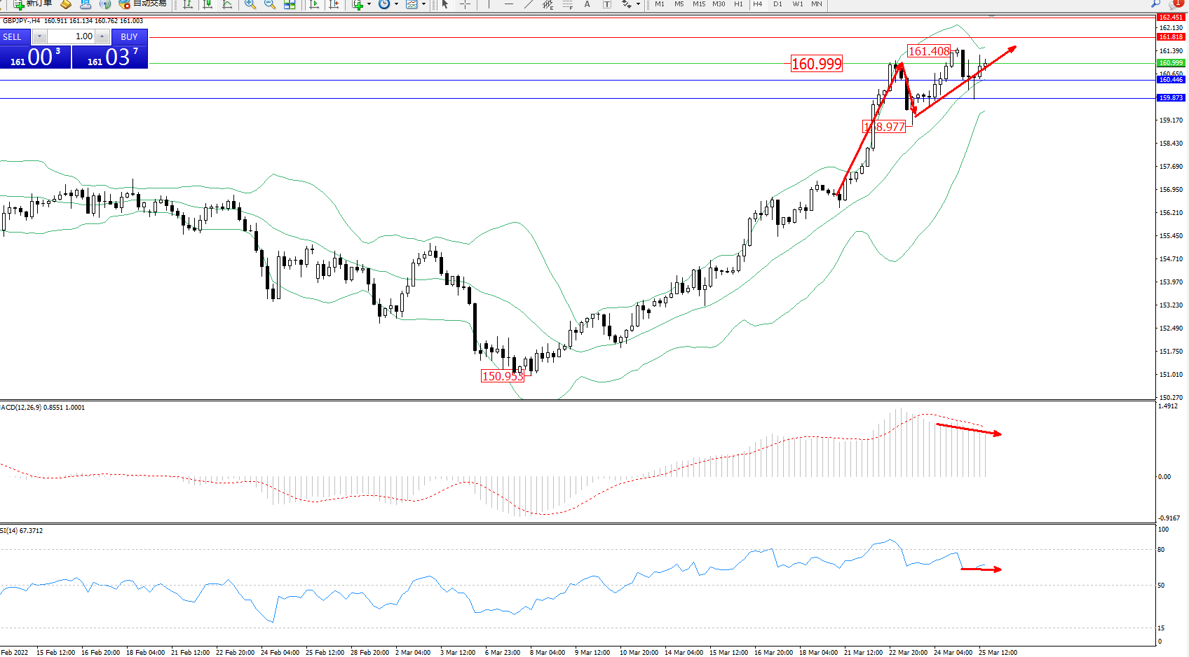 交易策略:160.999上方看涨,目标161.818、162.451