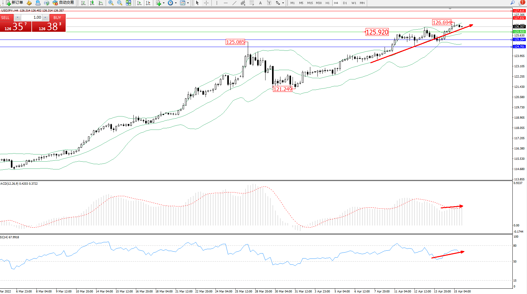 技术点评:多头动力延续布林带指标通道中上轨区间持续震荡上扬,高位抵达126.694附近节点后开始整理,短期多头动力有继续向上移动态势,布林带指标呈上行趋势走势后高位开始缓慢张口,MACD指标处于多头区域高位维持震荡上移,RSI指标处于多头区域维持震荡向上整理平移中;