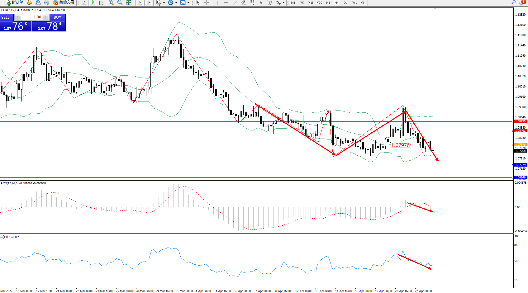 欧元美元EURUSD—4小时K线图显示: