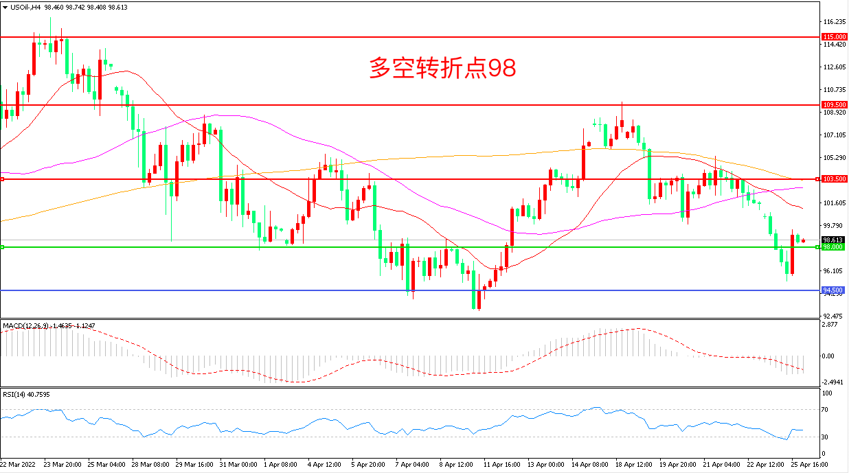 周一(4月25日),疫情令市场担心需求不振,加之美元走强施压,风险资产遭到抛售,美国WTI原油震荡下行,收报98.72美元/桶。目前恐慌悲观情绪笼罩整个市场,但好在原油市场自身库存低位大背景下,还是限制了资金做空冲动,虽然油价自身还是相对抗跌,但预计仍将以弱势震荡为主。