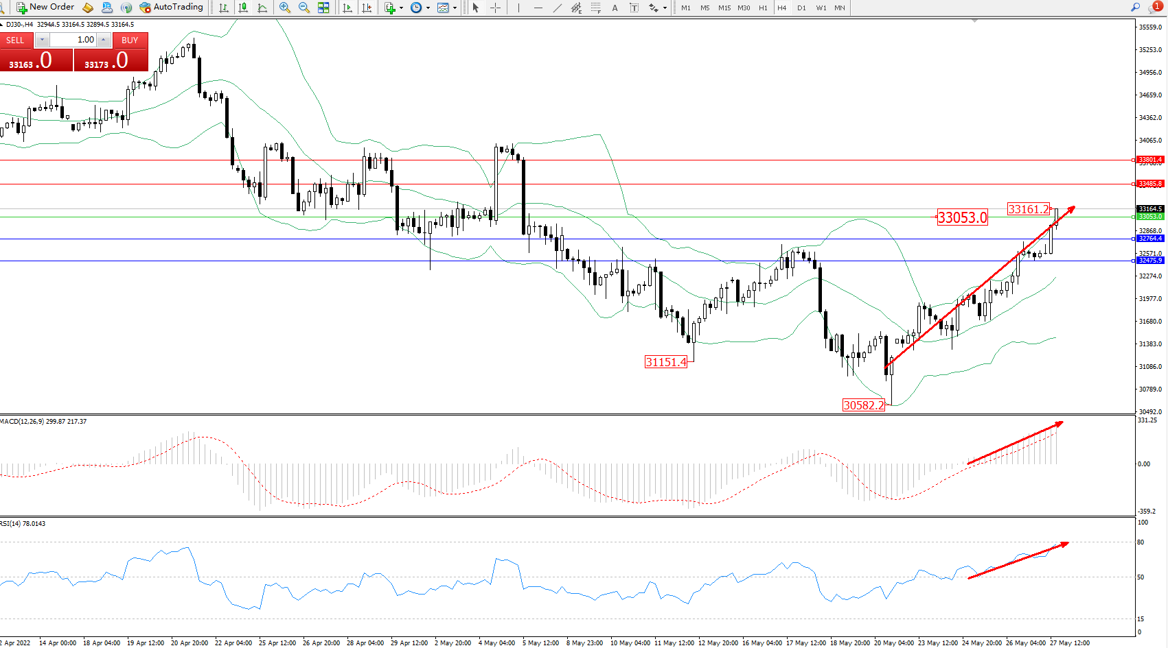技术点评:多头动力延续布林带指标通道中上轨区间持续震荡上扬,高位抵达33161附近节点后整理,短期多头动力有继续向上拉升态势,布林带指标呈缓慢张口走势持续中,MACD指标处于多头区域维持震荡不断拉升中,RSI指标处于多头区域维持震荡上扬至超买区80均衡线下侧整理;