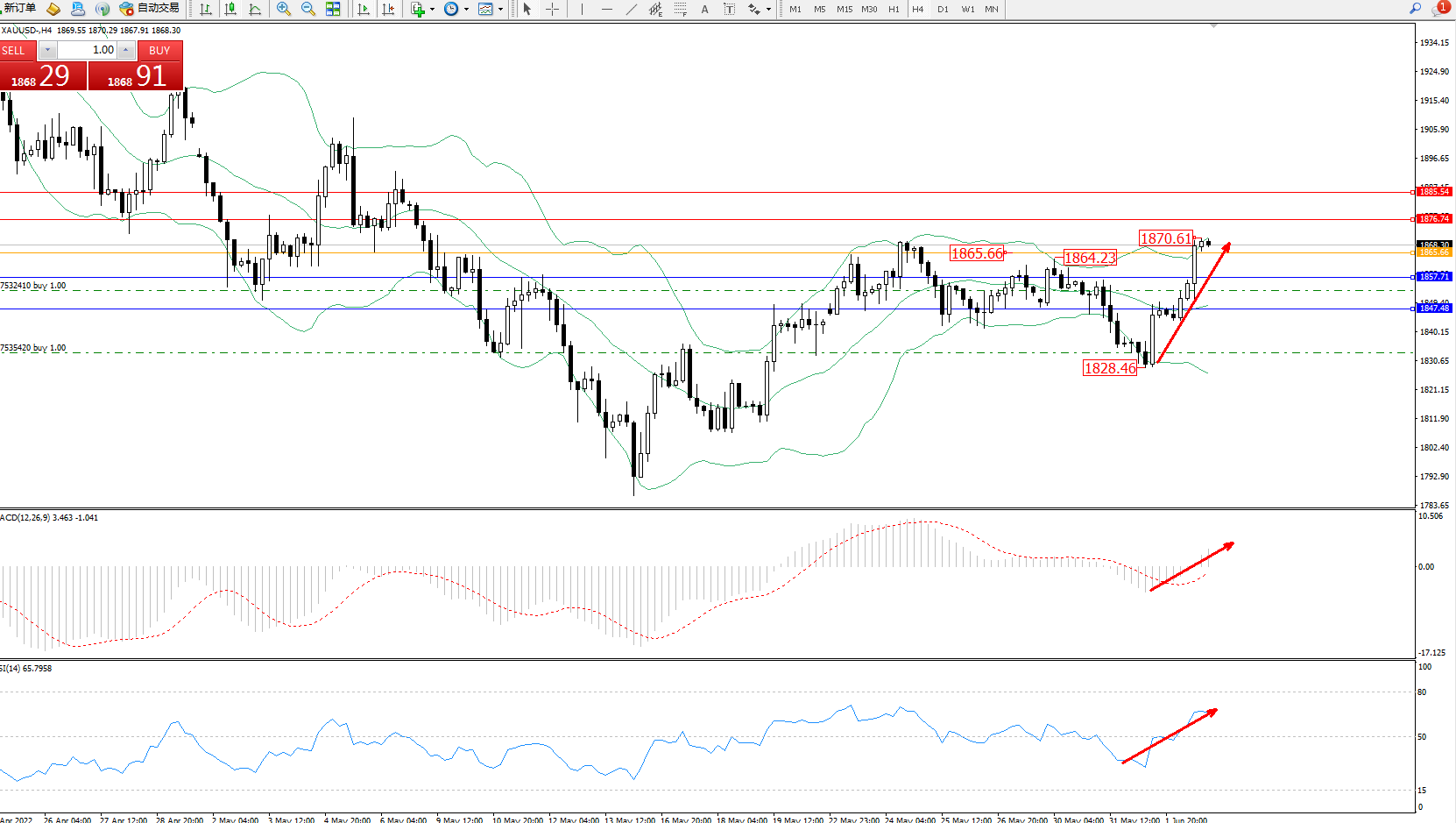 技术点评:多头动力强势反转上移,触及布林带指标上轨1870附近节点后开始整理,短期多头动力有继续向上移动态势,布林带指标呈张口走势持续中,MACD指标处于0轴线上方多头区域维持震荡向上移动,RSI指标处于50均衡线上側维持震荡不断拉升中;