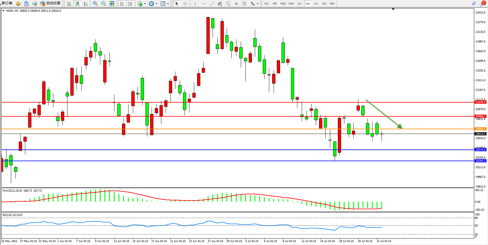 香港恒生指数7月22日(周五)收盘上涨34.51点,涨幅0.17%,报20609.14点;港股三大指数午后一度转跌,尾盘回升小幅收涨,恒生科技指数涨0.33%。大型科技股涨跌各异,快手涨超3%,百度、阿里巴巴小幅上涨,网易、腾讯、京东、小米飘绿;富士康概念股再度拉升领涨,今日南下资金净流入16.29亿港元,大市成交额为851亿港元。