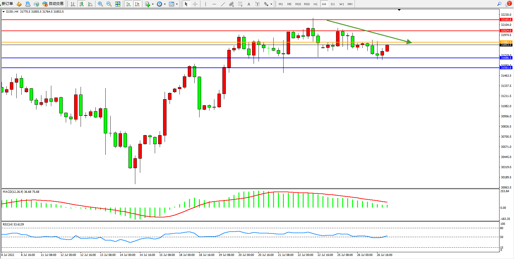 道琼斯指数7月26日(周二)收盘下跌228.66点,跌幅0.71%,报31761.38点;市场普遍预期美联储将把联邦基金利率目标上调75基点至2.25%-2.5%区间。在预测通胀这件事上栽过跟头的美联储很可能不想就利率需达到多高才能遏制通胀给市场太多指引。
