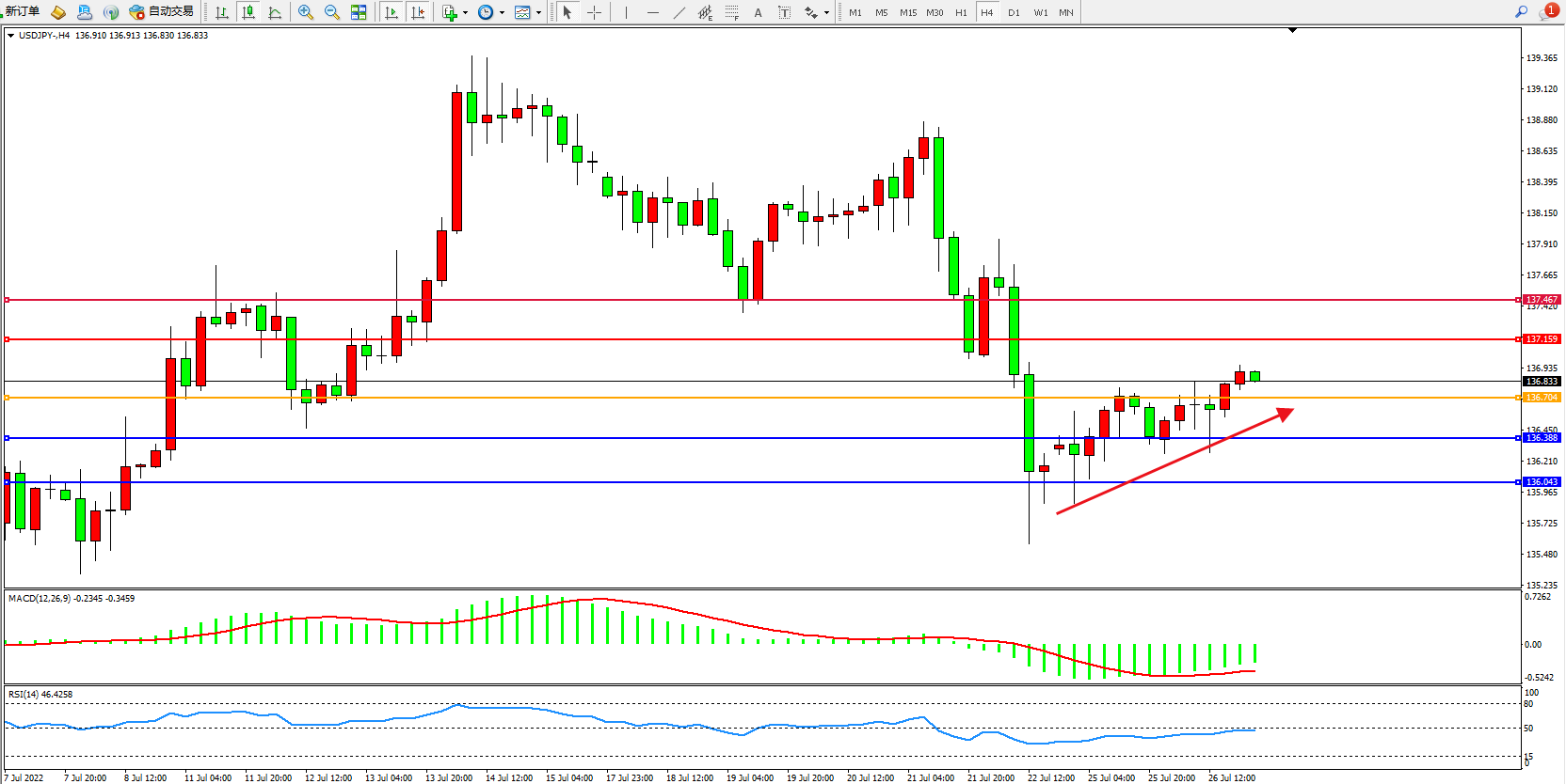 4小时图看:低位多头动力维持震荡上扬走势持续,短期低位拉升态势良好,MACD指标处于空头区域低位维持整理上移,RSI指标处于50均衡线下侧徘徊中;