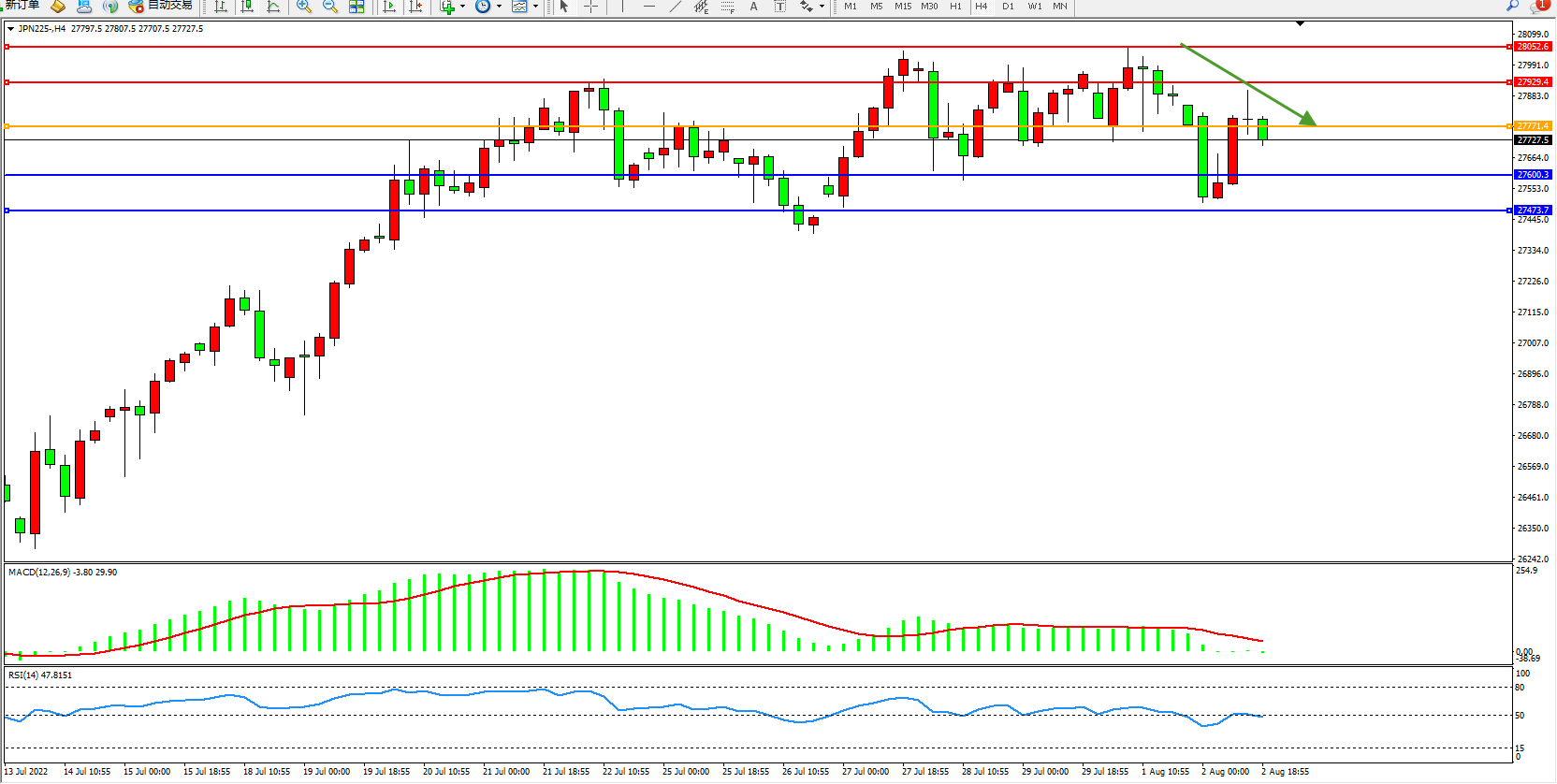 日经指数JPN225——4小时K线图显示: