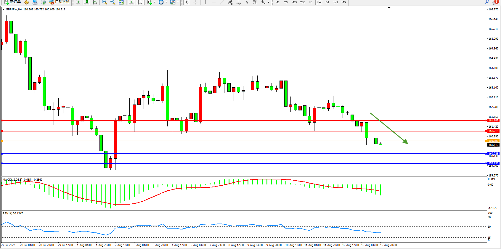 4小时图看:空头动力维持震荡下行态势良好,短期跌势未见止步,MACD指标处于空头区域弱势整理向下移动,RSI指标处于50均衡线下侧窄幅整理;