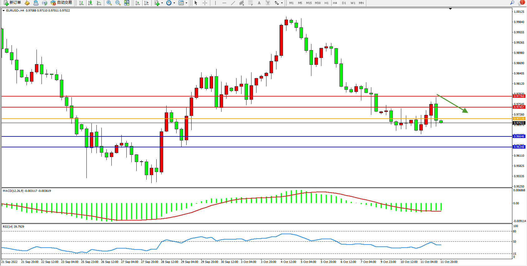 欧元美元EURUSD—4小时K线图显示: