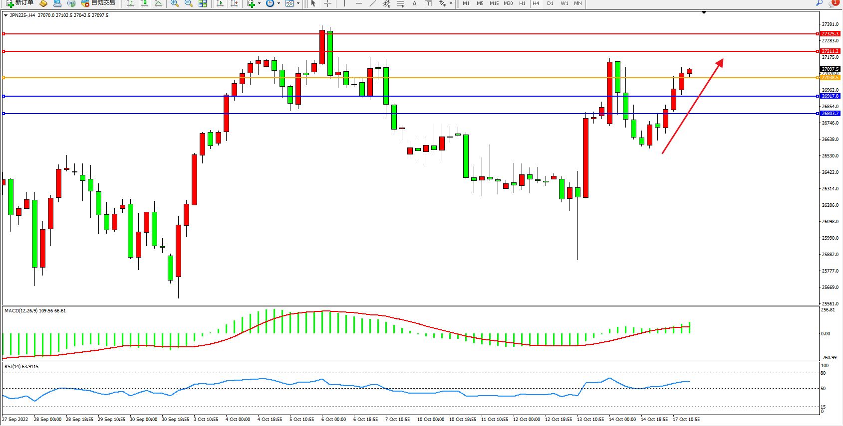 日经225指数10月17日(周一)收盘下跌323.76点,跌幅1.20%,报26767.00点。日本央行行长黑田东彦在日本众议院预算委员会上表示,在原材料价格高涨的背景下,物价上涨是暂时的。他强调,为了实现持续稳定物价的目标,将继续实行货币宽松政策。