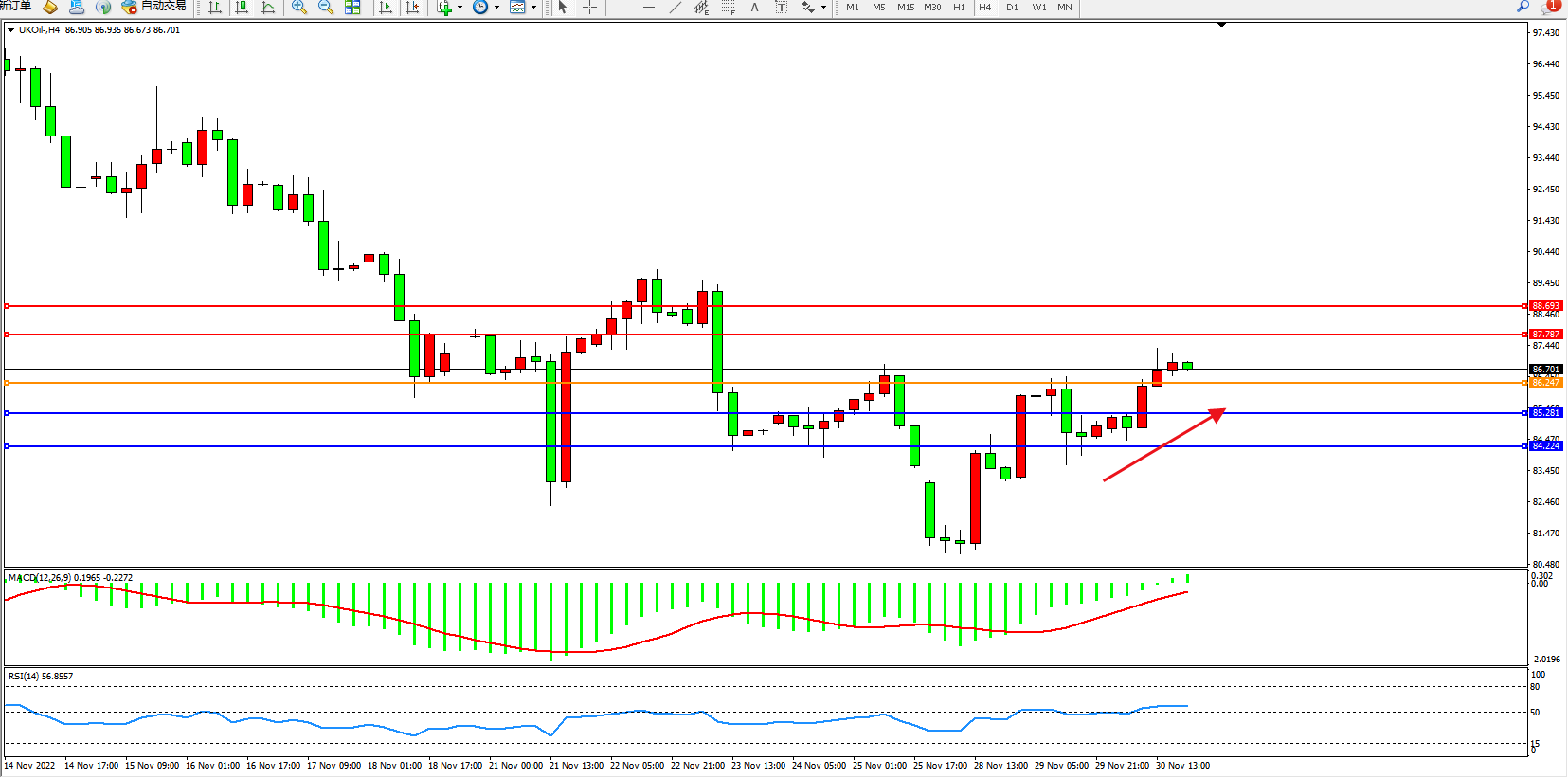 4小时图看:低位多头动力维持震荡上扬,短期看涨情绪持续,MACD指标处于0轴线上側徘徊,RSI指标处于50均衡线上側弱势整理;