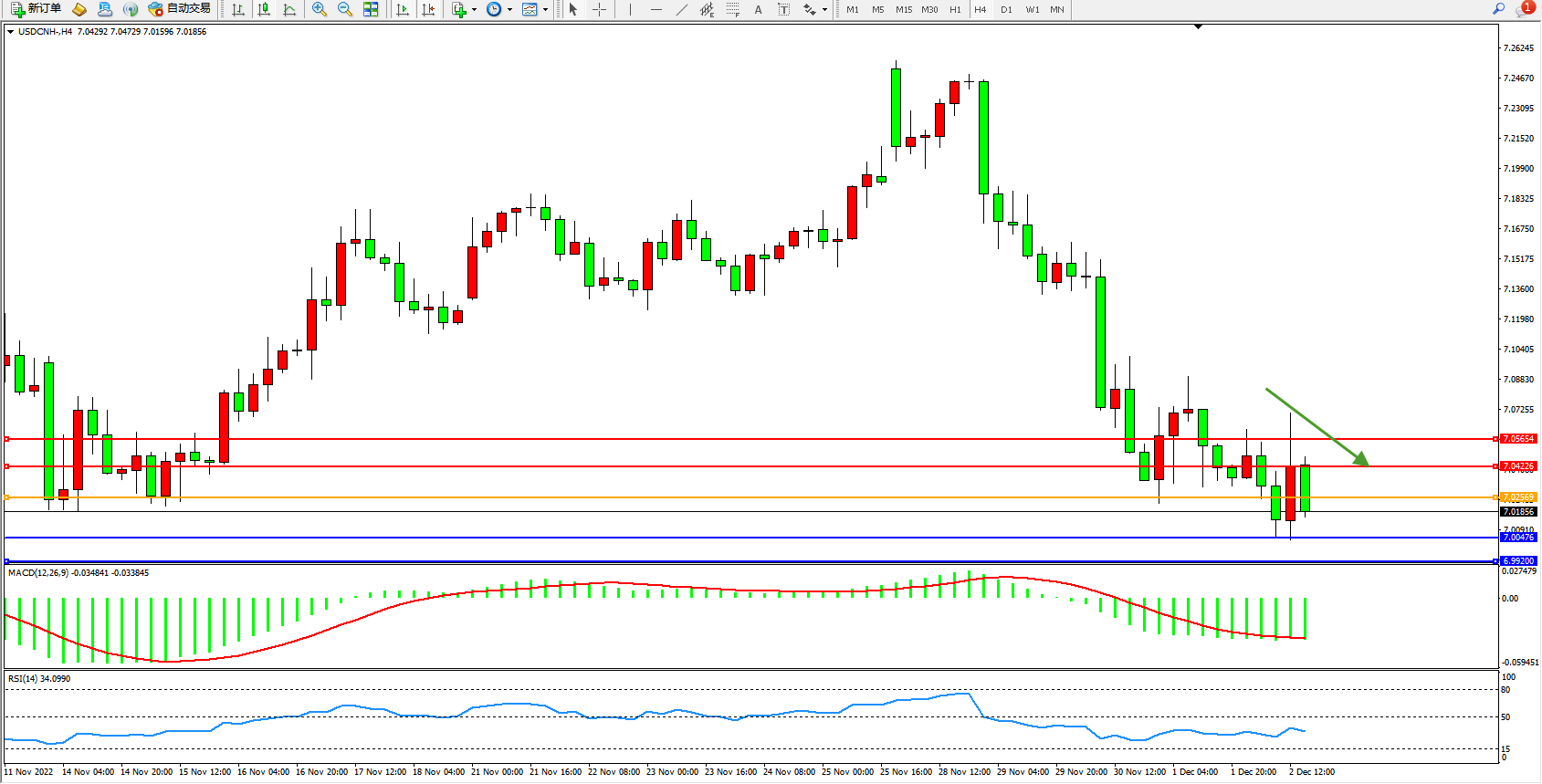 交易策略:7.02569下方看跌,目标7.04226、7.05654