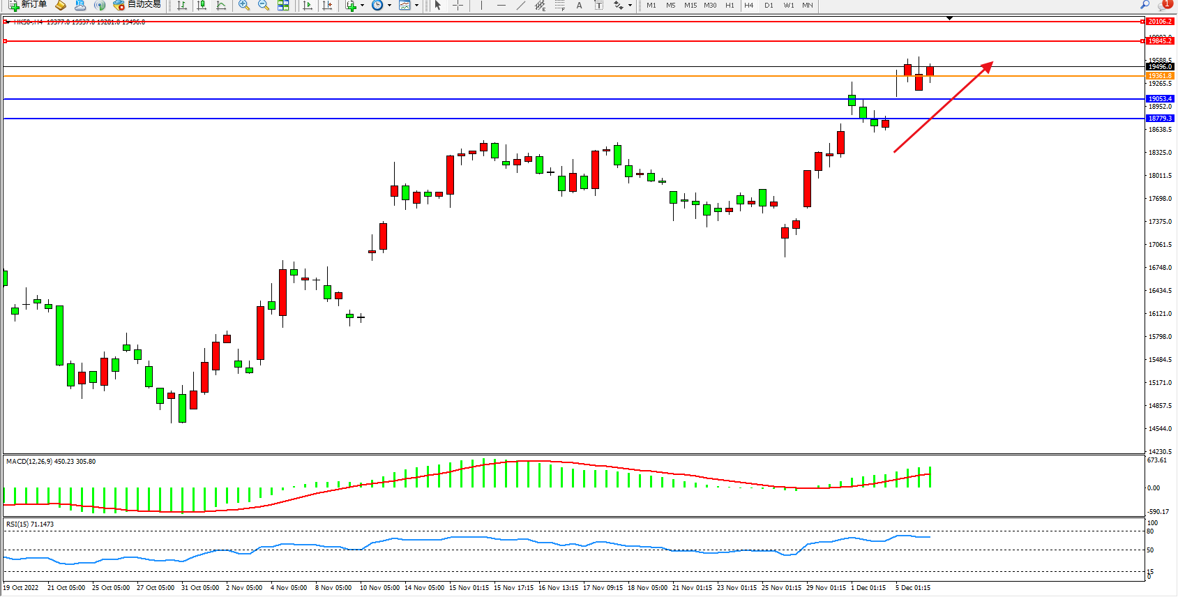 4小时图看:多头动力强势上扬,高位窄幅整理,市场看涨情绪依旧,MACD指标处于多头区域缓慢上行,RSI指标处于多头区域高位整理;