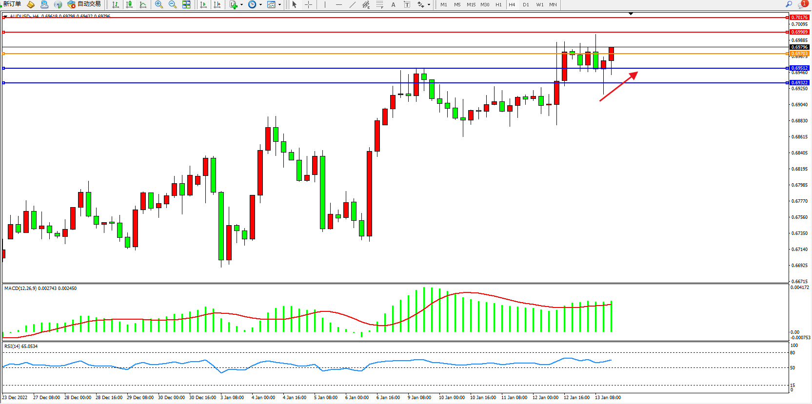 交易策略:0.69796上方看涨,目标0.69989、0.70176