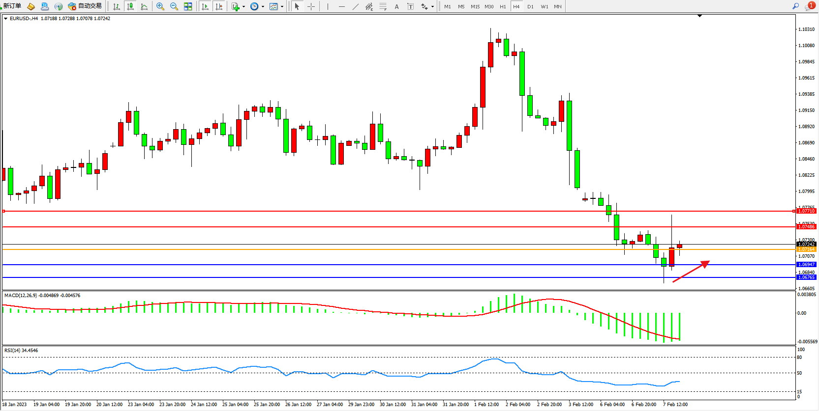 欧元美元EURUSD—4小时K线图显示: