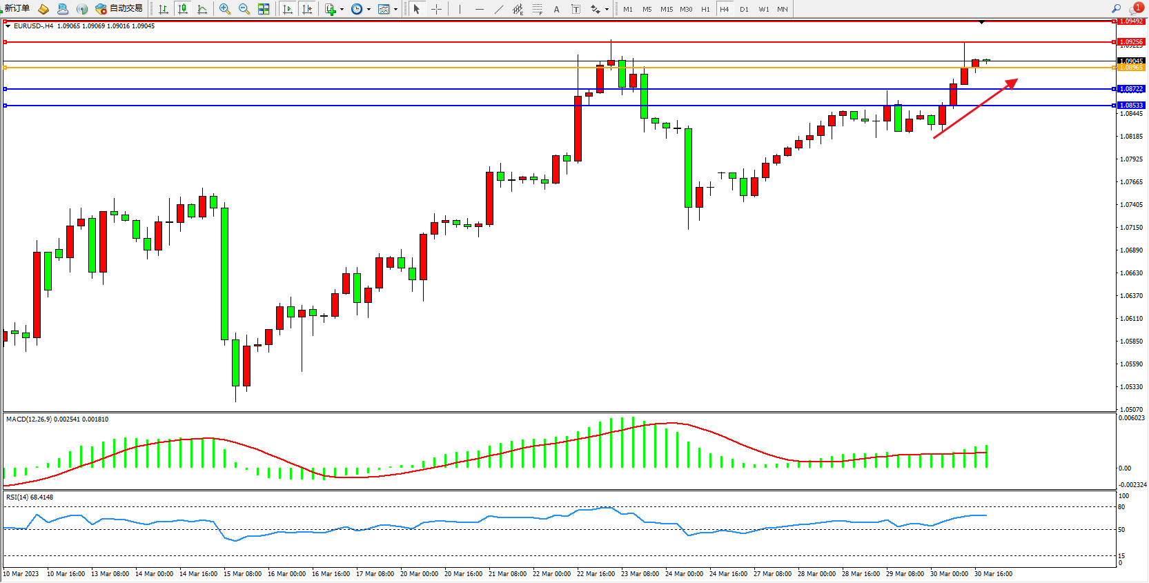欧元美元EURUSD—4小时K线图显示: