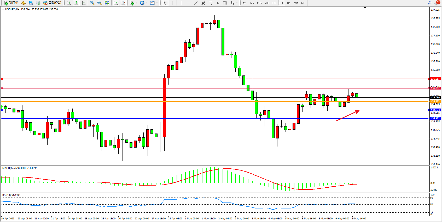 4小时图看:短期窄幅整理,市场多头动力有缓慢涌现迹象,但后续动力欠缺,MACD指标处于0轴线附近弱势徘徊,RSI指标处于50均衡线附近弱势整理;
