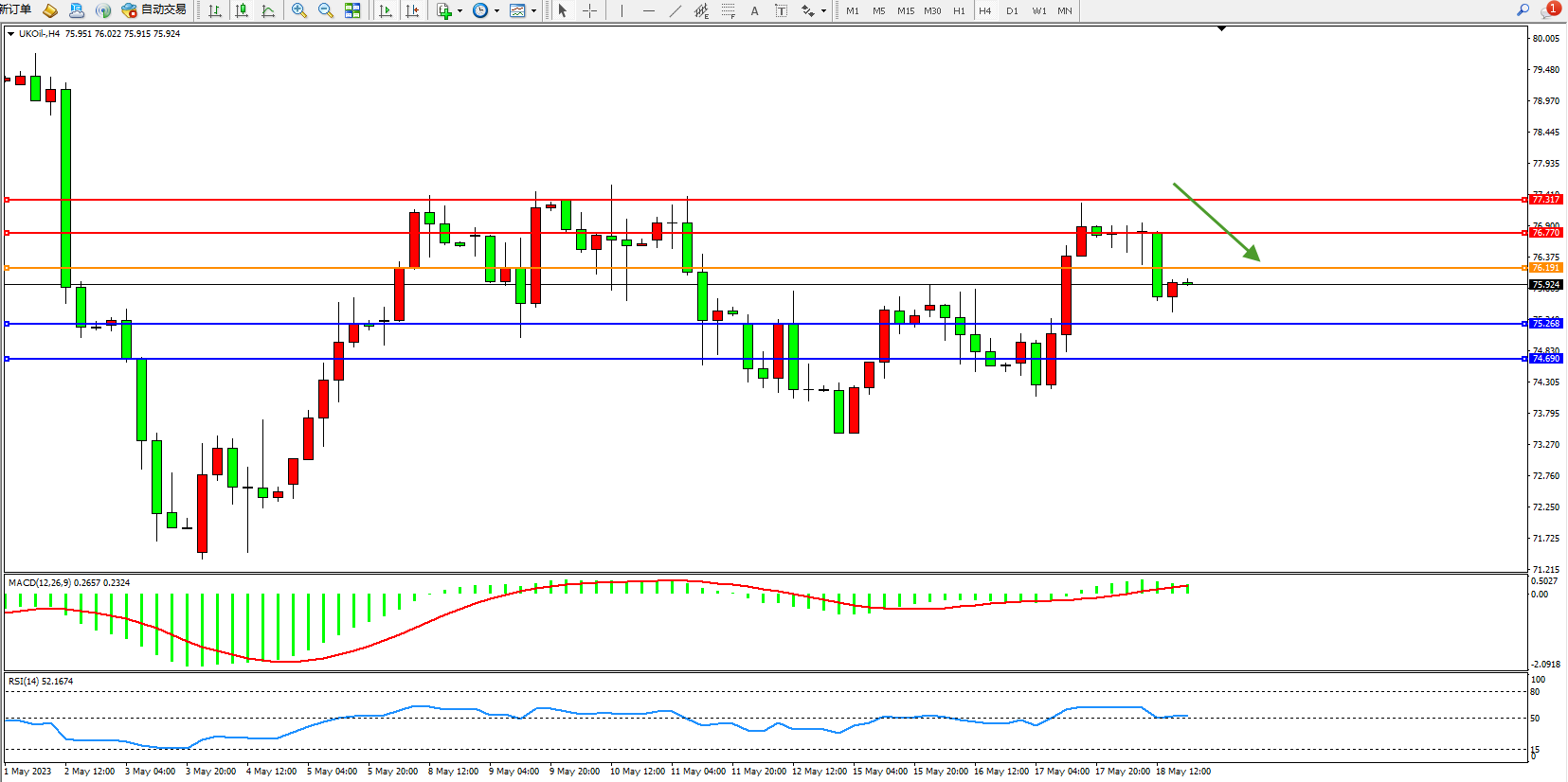 4小时图看:多头动力维持震荡上移后遇阻整理,市场空头情绪开始伺机入场,短期跌势或将延续,市场整体处于看空走势中,MACD指标处于0轴线上側弱势整理,RSI指标处于50均衡线附近弱势徘徊;