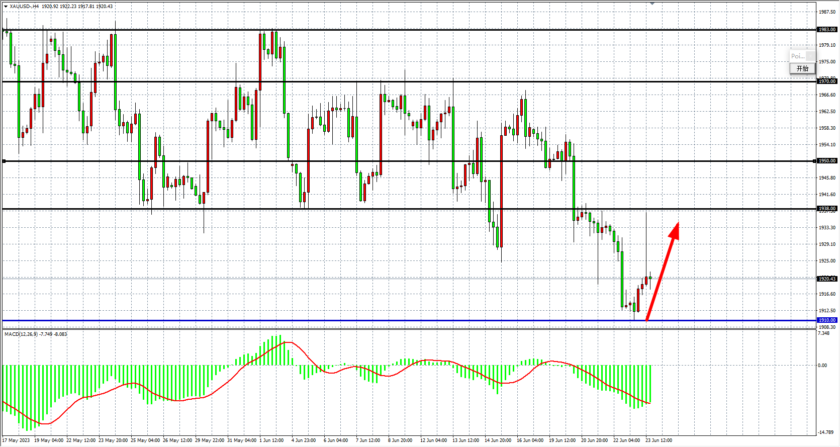 4小时图看,黄金一度反弹触及1938随后再度回落至1920附近,MACD量能在零轴之下运行,空头走势仍旧偏强,但短线存在反弹空间,支撑关注1910,阻力关注1938附近。
