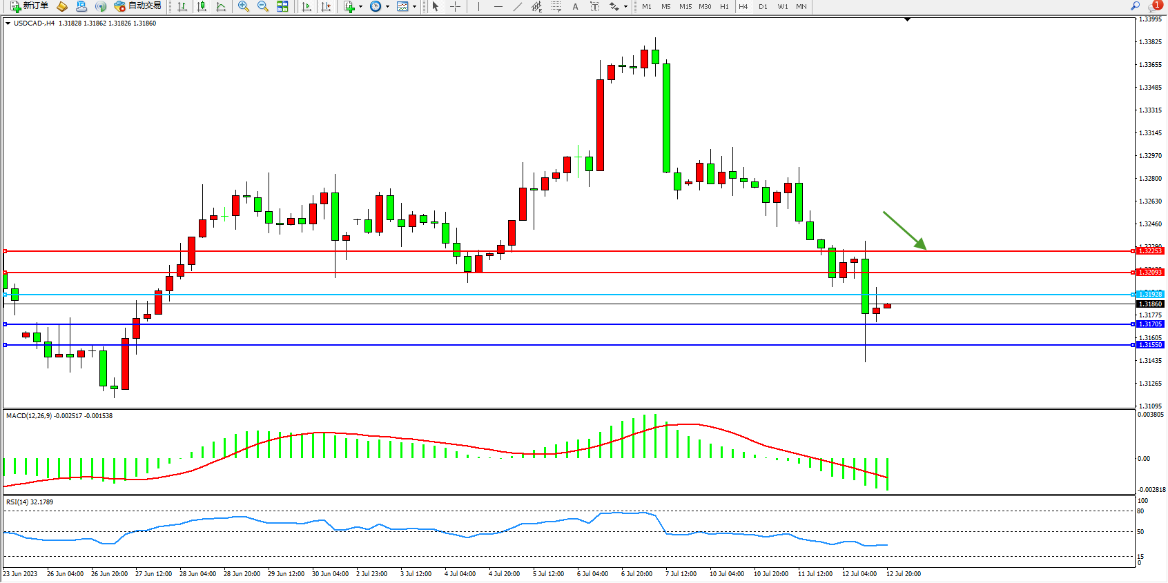 美元兑加元维持1.31860附近震荡,加拿大至7月12日央行利率决定 5%,预期5.00%,前值4.75%。符合市场预期,为连续第二次加息25个基点。加拿大央行提高了今年和2024年的消费预测。