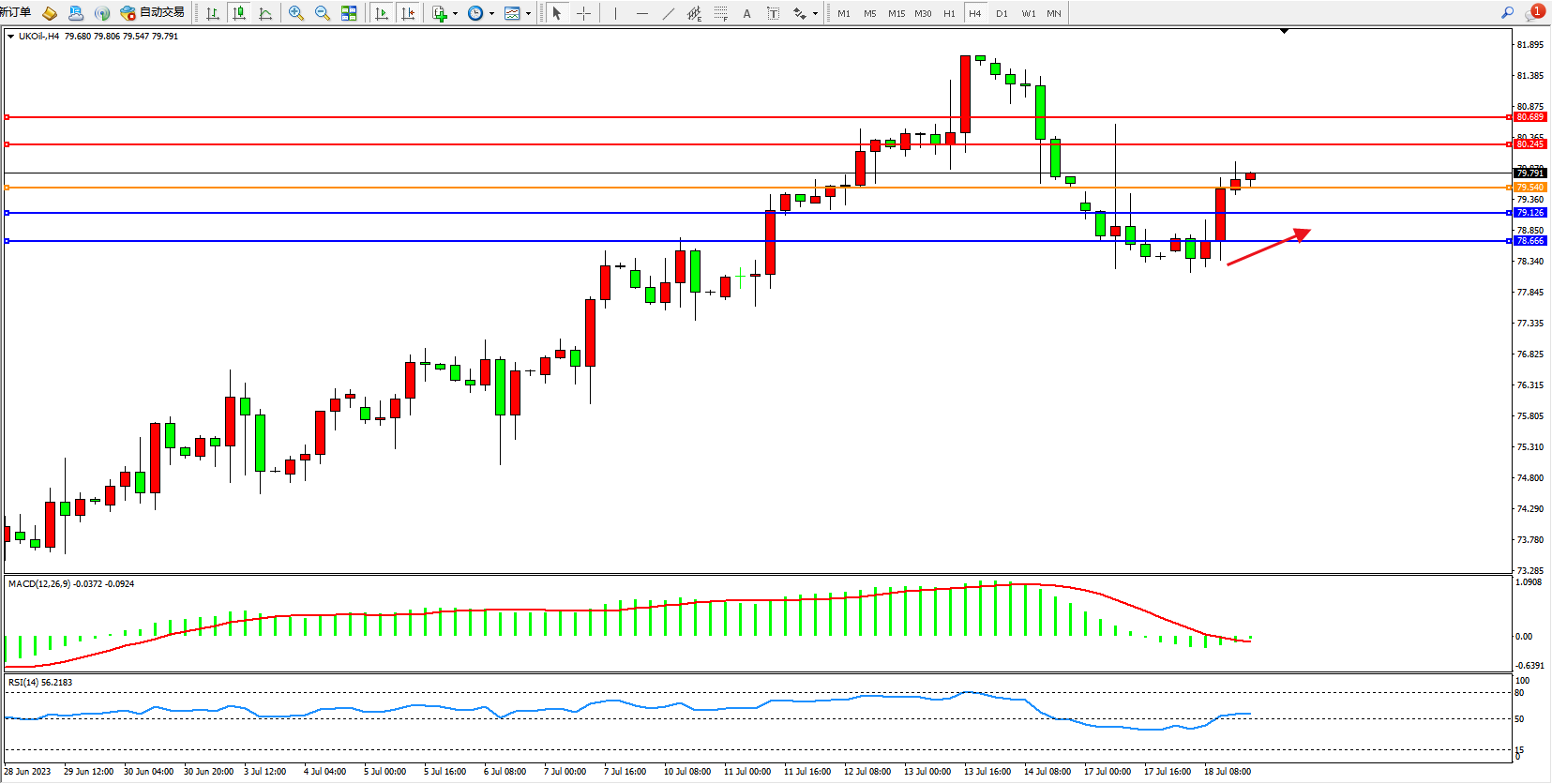 4小时图看:多头动力短期整理后震荡上扬,短期有继续向上移动态势,MACD指标处于0轴线附近弱势徘徊,RSI指标处于50均衡线上側弱势整理;
