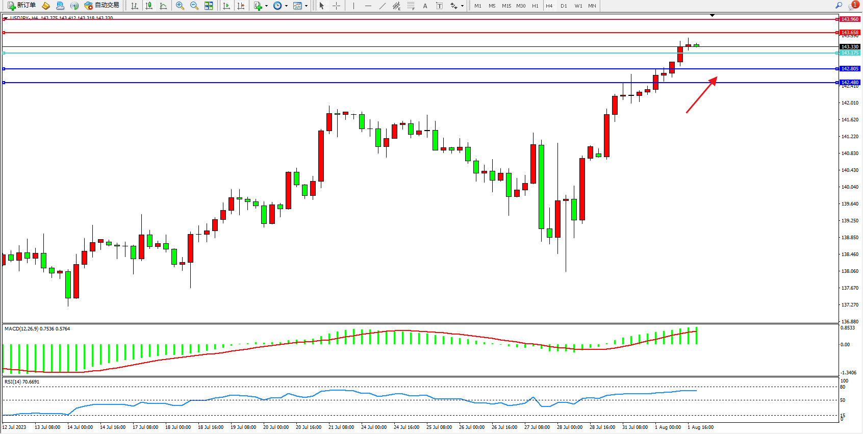 4小时图看:高位多头动力强势震荡上扬,短期看涨情绪笼罩,市场多头不断拉升中,MACD指标处于多头区域高位整理,RSI指标处于多头区域高位徘徊;