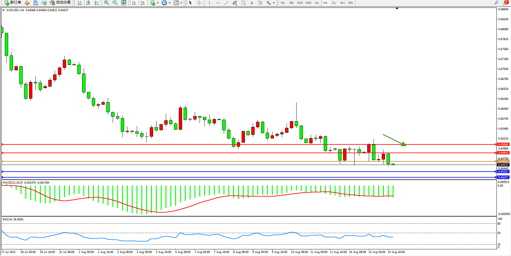 交易策略:0.64625下方看跌,目标0.64357 0.64207