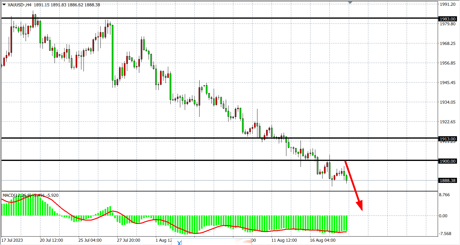 4小时图看,黄金维持在1900关口之下,MACD量能延续零轴下持续均匀放量,走势维持空头行情,阻力继续关注1900-1913附近,支撑关注下方1880-1860。