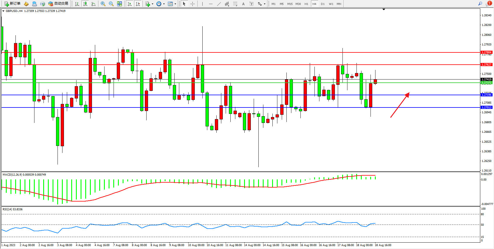 4小时图看:市场整体维持宽幅震荡,短期或维持区间震荡走势,多头动力有震荡上移迹象,MACD指标处于0轴线上側弱势整理,RSI指标处于50均衡线上側弱势徘徊;