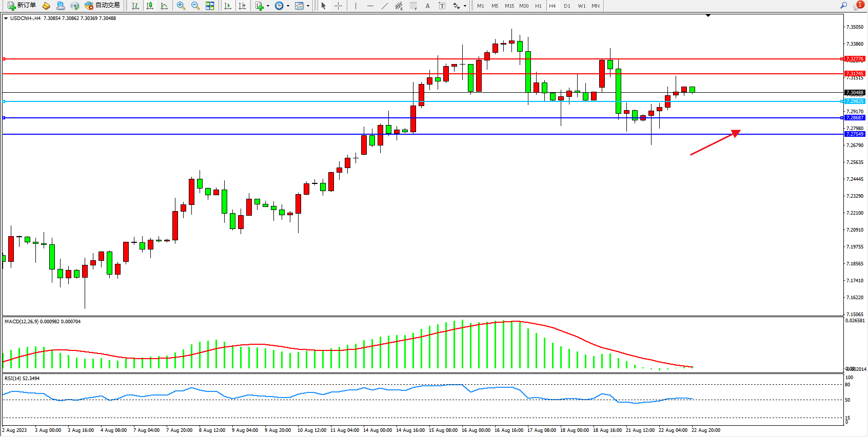 交易策略:7.29825上方看涨,目标7.31745 7.32776