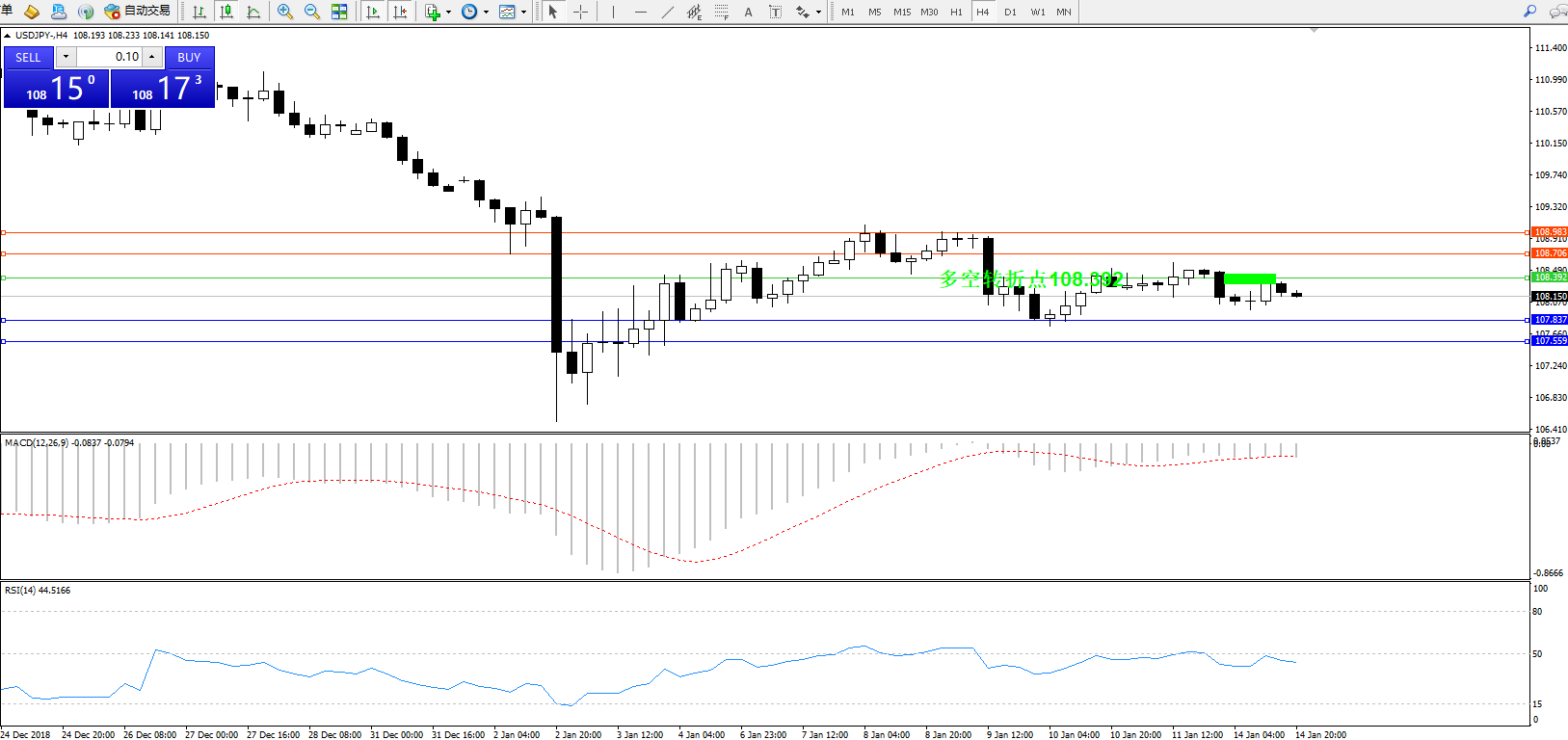 交易策略:108.392下方看跌,目标107.837107.559
